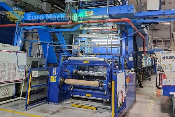 CERUTTI RB 908 Rotogravure printer allows printing 7 colours on PE; PP, OPP, PET and paper, printing width 1200 mm Rotogravure printing press is used in flexible packaging and film printing sector for producing multi-color, high resolution printed materials. Manufacturer: Cerutti BOBST Model: RB 908 M4 No. of colours: 7 colours Material to print: PE, PP, OPP, PET, Paper Printing width: 1180 mm Material width: 1200 mm Min. web width: 700 mm Max. Roll weight: 1000 kg Mechanical speed: Up to 300 m/min Number of dryers: 10 + after dryer Accessories:- Electrostatic discharge (Eltex)