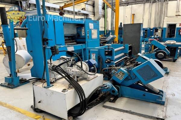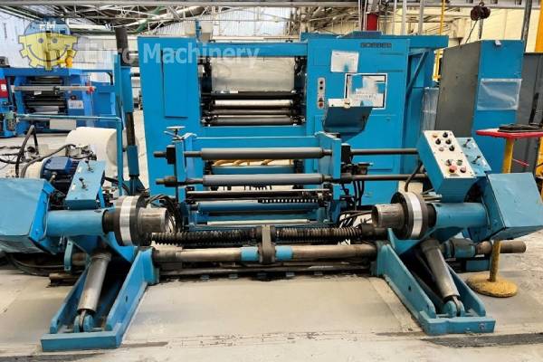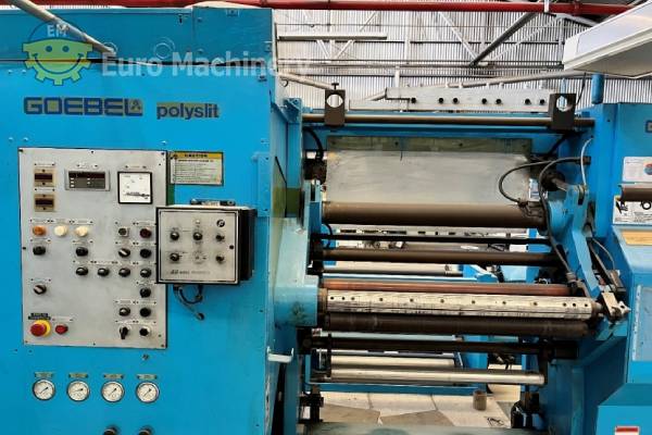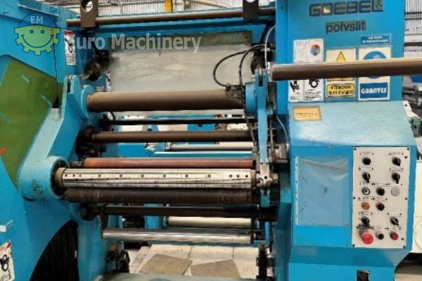 GOEBEL Polyslit slitter rewinder to cut aluminum, film and paper. This slitting rewinding machine is able to cut from 50 mm to 800 mm, working speed 800 m/min. Brand & Model: GOEBEL POLYSLIT Material to cut: Aluminum, film, paper Slitting width: Min 50 mm – max 800 mm Thickness min-max: 0.009 – 0.051 mm Unwinder:- Max roll diameter: 1.100 mm