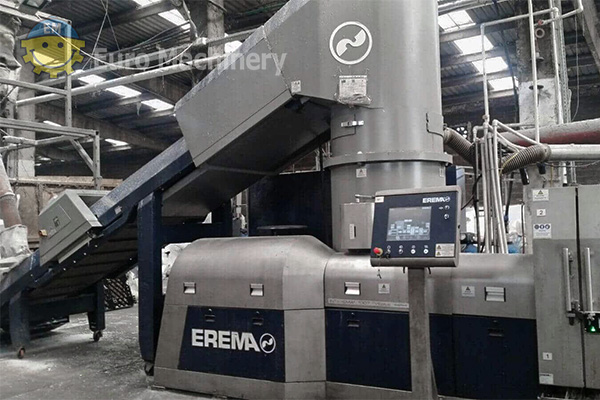 INTAREMA 1007TVE repelletizing line to process LDPE, LLDPE, PP, PS, Recycling line with double degassing, fully automatic bachflush double fritation screen changer, hot granulation on die and output up to 400 Kg/h. Brand & Model: INTAREMA 1007 TVE HG 4s/104RTF Material that can be processed: LDPE, LLDPE, PP, PS Screw diameter: 70 mm Output: Up to 400 kg/h, depending on the type of material and feeding rate. Degassing: Double degassing Screen changer before degassing: Fully automatic backflush double filtration Material feeding system: Conveyor belt with metal detector Extruder hopper type: Agglomerator/Cutter Compactor – Extruder combination Pelletising system: Hot Granulation on Die – Water Circle system Power: Voltage: 3 x 400V + N + Pe Attachments and accessories:- Water bath
