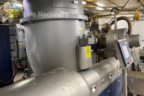 Plastic pellet making machine INTAREMA 1108 TVEplus with double degassing and laser continuous filter. Recycling line Intarema to process PE, PP and screw diameter 80 mm, output up to 450 Kg/h. Brand & Model: EREMA Intarema 1108 TVEplus LF Material that can be processed: PE, PP Screw diameter: 80 mm Output: Up to 450 kg/h, depending on the type of material and feeding rate. Degassing: Double degassing Screen changer before degassing: Laser sheet perforated continuous filter Material feeding system: Conveyor belt with metal detector Extruder hopper type: Agglomerator/Cutter Compactor – Extruder combination Pelletising system: Hot Granulation on Die – Water Circle system Power:- Voltage: 3×400 VAC + PE