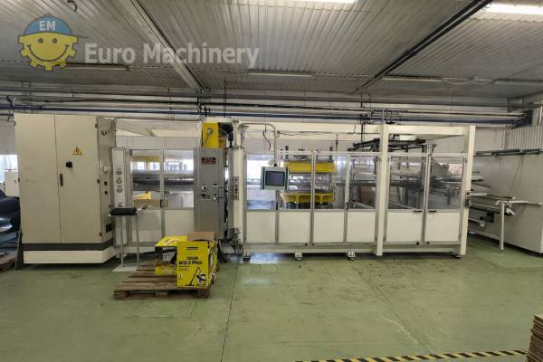 Used pressure vacuum thermoforming line (OMG OMF/PVE 50-PN-M) for processing plastics such as PS, PET, PP, and PVC. The machine includes forming, cutting, and stacking stations. Type: Pressure Vacuum Thermoforming Brand: OMG OMF/PVE 50-PN-M- Materials to be processed: PS, PVC, PET, PP, EPS