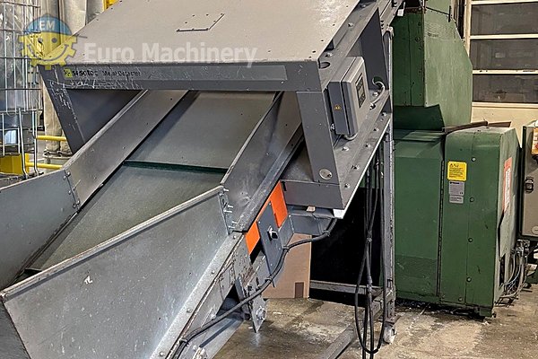 Rapid 80 45 KB ia an heavy-duty industrial granulator designed for processing plastic materials with a 500mm rotor and 400 kg/hour output capacity. Features multiple grinding grids, complete knife sets, and integrated conveyor system with metal detection tunnel for reliable recycling operations.