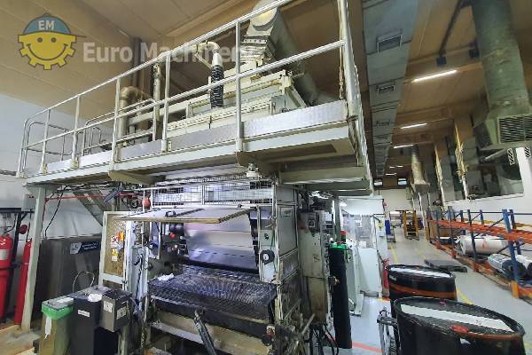 ROTOMEC triplex lamination machine to process Lam/Coat/Lat. Rotomec laminator to work with web with from 650 mm to 1320 mm and mechanical speed around 350 m/min. Brand & Model: ROTOMEC TRIPLEX 1320 350 Process: Lam/Coat/Lac Max web width: 1320 mm Min web width: 650 mm Unwinders reel max diameter: 1000 mm Unwinders reel Core diameter: 3” – 6” Unwinders reel max. weight: 1200 daN Rewinder reel max diameter: 1300 mm Rewinder inside core diameter: 150 mm Rewinder reel max. weight: 1750 daN Heating: Indirect by thermal oil Minimum oil temperature: 210 °C Number of dryers: 2 Max mechanical speed: 350 m/min – 250 m/min Accessories:- Electrostatic discharge