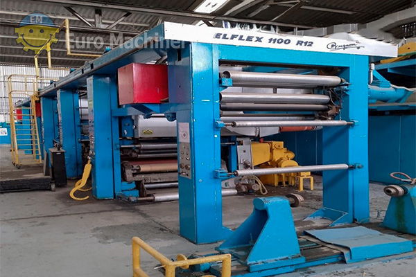The TECMO Elflex 1100 R12 is a versatile laminator designed for flexo printing, coating, and embossing on a variety of materials. Type: Flexo printing, coating and embossing aluminum, film, paper Type of production: 1 color flexo printing (front and back), solvent based coating in 3 stations and 1 embossing unit Web width: Min 570 – Mac 1050 mm Reels:- Diameter of unwinding reels: 650 mm