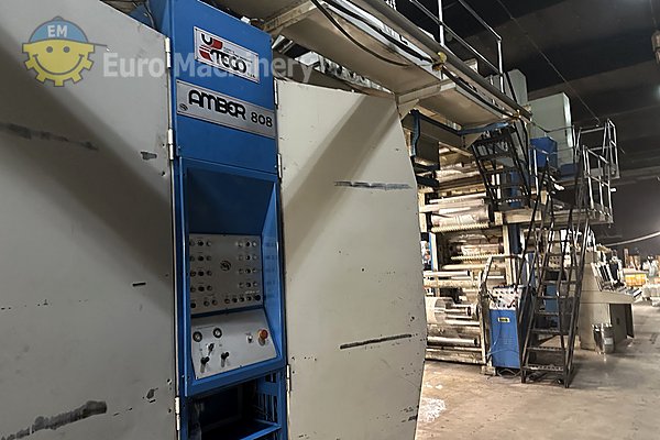 Uteco Amber is a professional 8-color flexographic printing press capable of printing on PE, PP, OPP, PET, and paper materials. Features motorized longitudinal register, electrical drying system, and speeds up to 300 m/min with a 1000mm printing width.